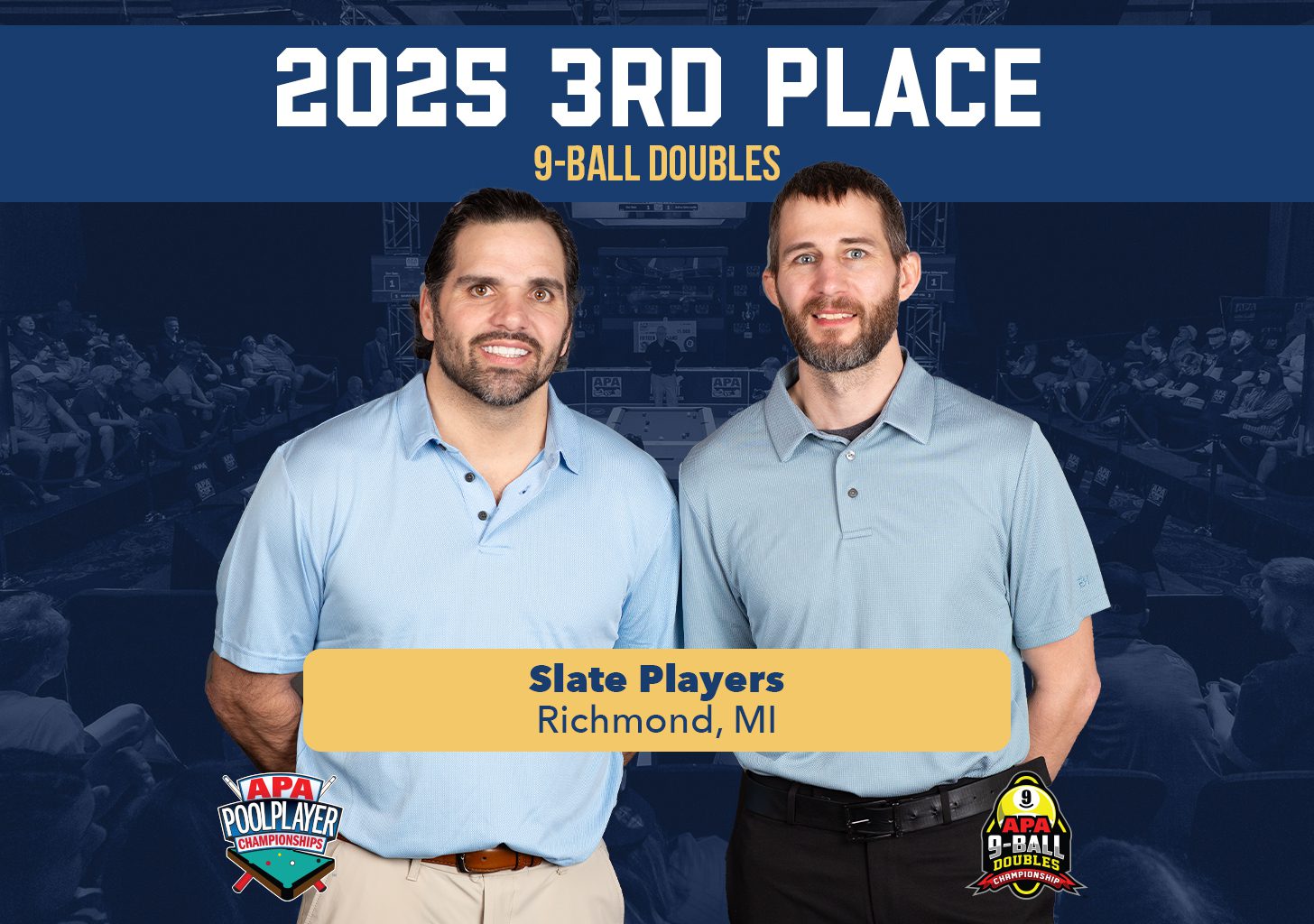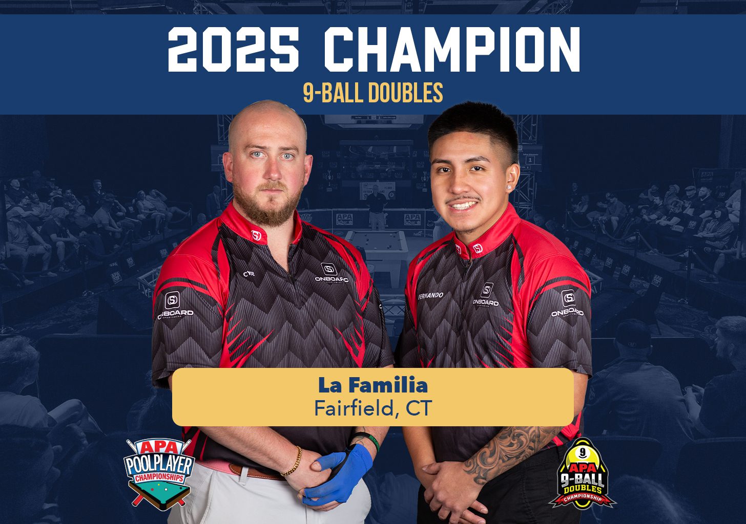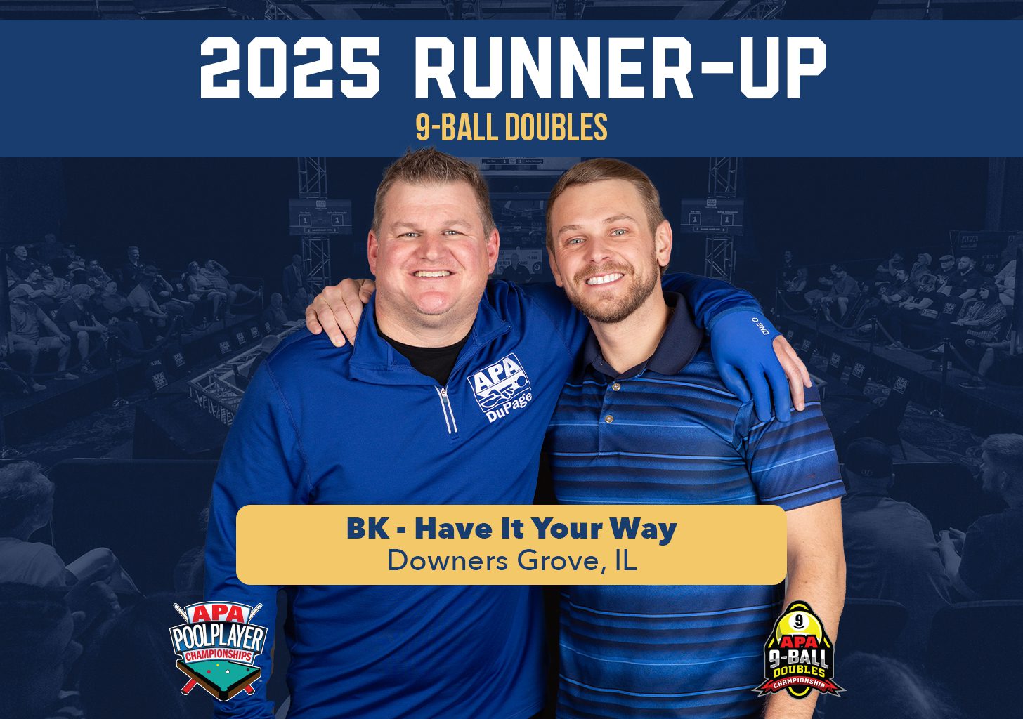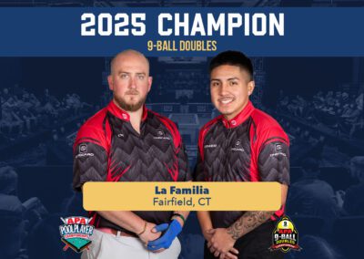 The 2025 9-Ball Doubles Championship finals hit the PoolDawg Championship Arena on Monday evening, April 28. BK – Have It Your Way – Brandon Tucker (SL6) and Kyle Burger (SL4) of Fairfield, Conn., were up against La Familia – Daniel Cyr (SL5) and Fernando Perez (SL5) of Downers Grove, IL. The race was 38-38.